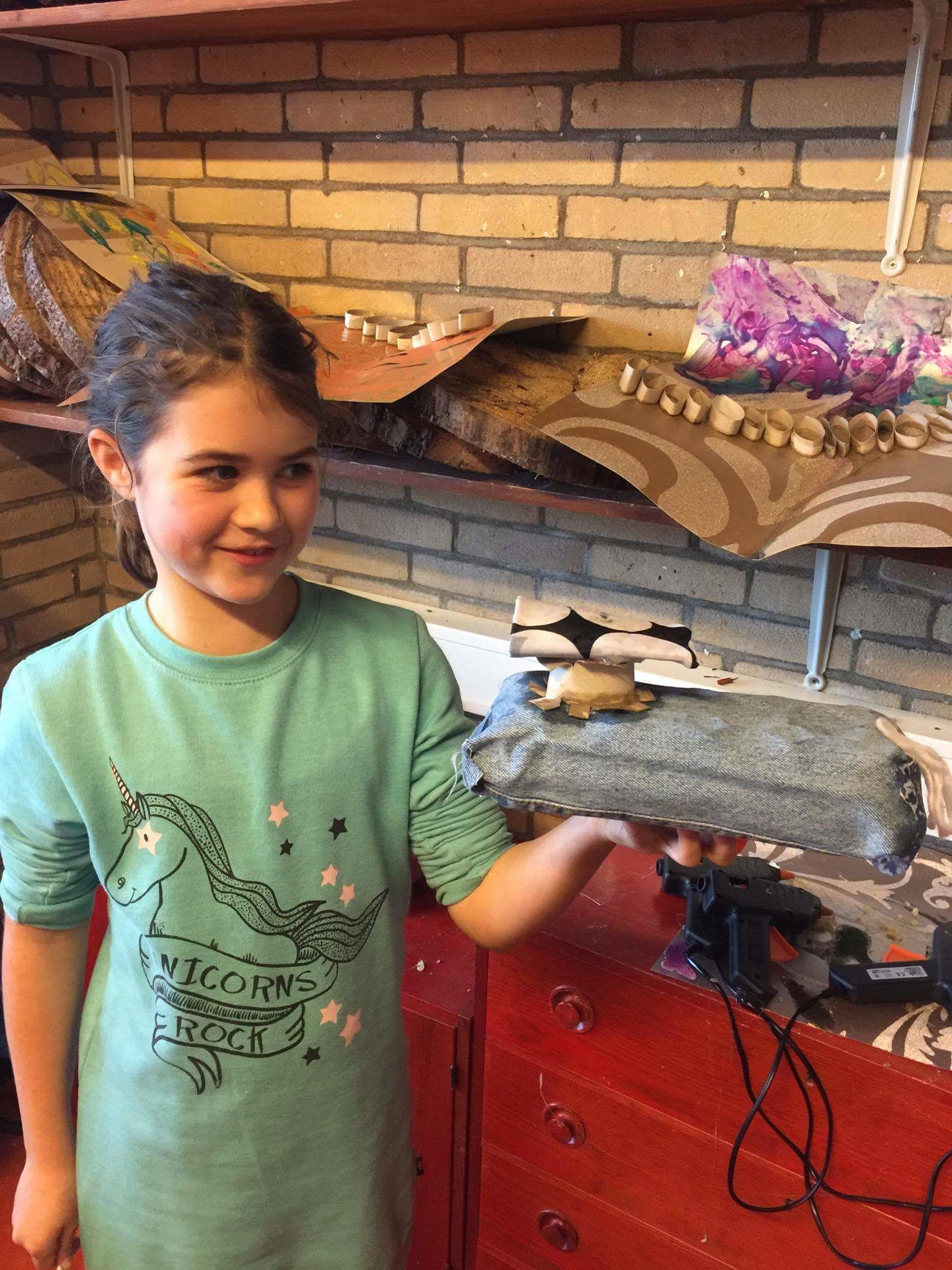 De kinderen die er vanavond waren hadden bedacht om van plastic, karton, papier, blikjes cola en veel lijm een soort accesoires te maken wat je kan dragen. Dit zag er echt te gek uit.
