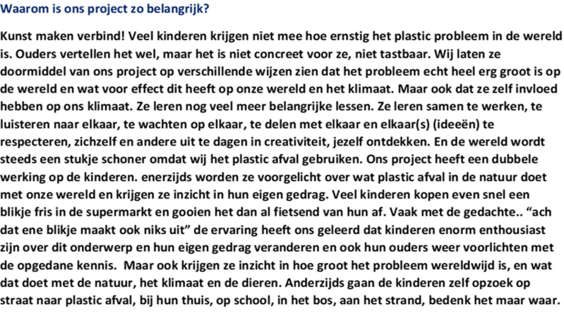 Alles in ons project is van straat afval gemaakt. We hebben ook veel jurken en kleding van plastic afval gemaakt. Deze jurken en kleding stukken worden ook echt door kinderen gedragen tijdens de expositie. Hoe fijn is het dat je ook echt je gemaakte werk kan zien. Dat je werk tot leven komt. Dat je trots kan zijn op je werk. Daar groeien kinderen van. Hun zelfvertrouwen wordt vergroot. Kinderen in Armoede of kinderen die door omstandigheden op de rand van de samenleving zitten kunnen in dit project echt een positieve ervaring opdoen. Alles wat ze maken is goed. Nu zijn ze ook een keer belangrijk. Het gevoel dat je mee mag doen en erbij hoort is voor kinderen fijn. Te ervaren dat je ook ergens goed in bent. Wij exposeren in kerken, verpleeghuizen, buurthuizen lege winkel panden etc.